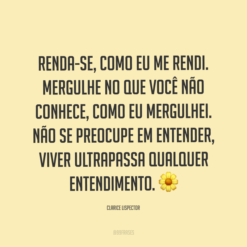 Não se preocupe em entender, viver ultrapassa qualquer entendimento. A maior perda é o que morre por dentro enquanto você ainda está vivo. Mergulhe no que você não conhece como eu mergulhei... A maior perda é o que morre por dentro enquanto você ainda está vivo.